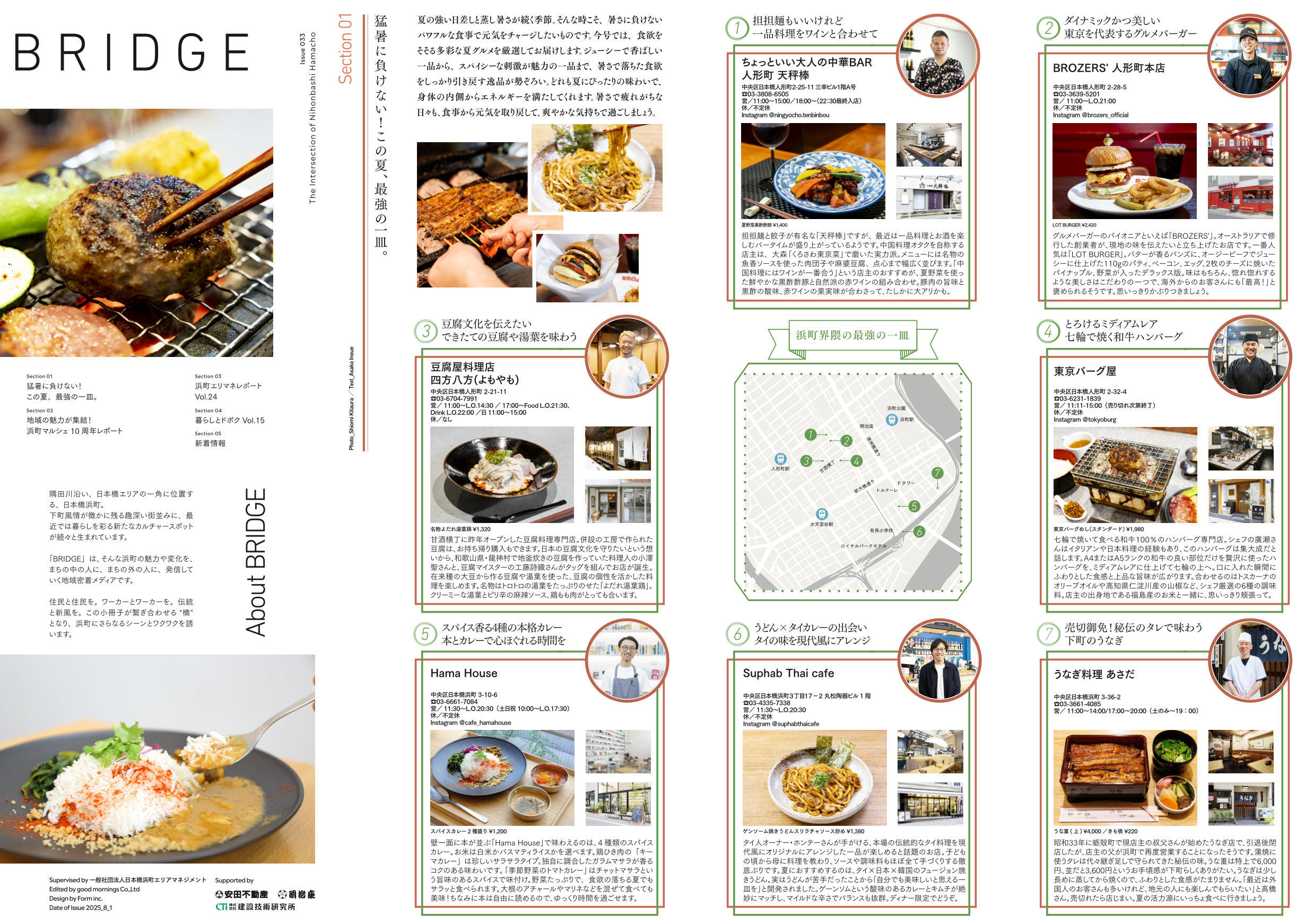 日本橋浜町を中心とした地域の情報をお届けする「BRIDGE No.033」が発行されました! PDFのダウンロードはこちらから↓ BRIDGE 005 2020/01/10 特集は 浜町の習い事・学び場ガイド BRIDGE 007 2020/07/10 特集は 祝100年! 日本の変わらぬ食卓の味「桃屋」 BRIDGE 014 2021/09/30 特集は 江戸から令和まで。浜町歴史探訪 BRIDGE 022 2023/01/30 特集は 浜町でもっと健やかに