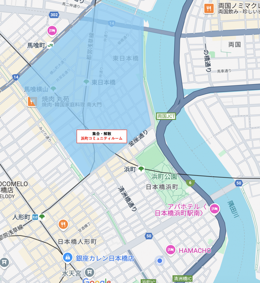 集合場所:中央区立浜町コミュニティルーム。(中央区日本橋浜町1-2-3)