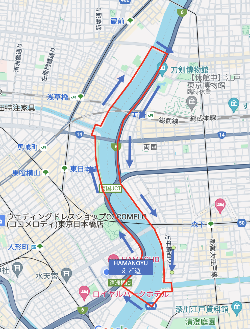 コース:えど遊〜隅田川テラス〜 〜蔵前橋〜隅田川テラス〜清洲橋〜えど遊(約5.5km)