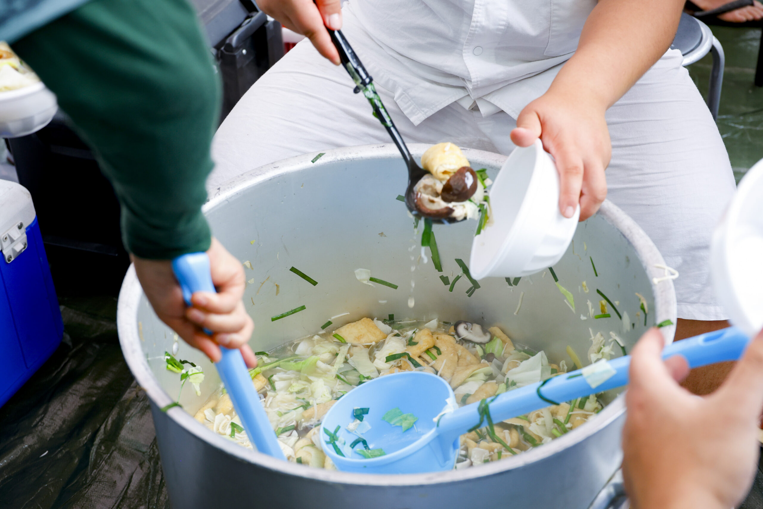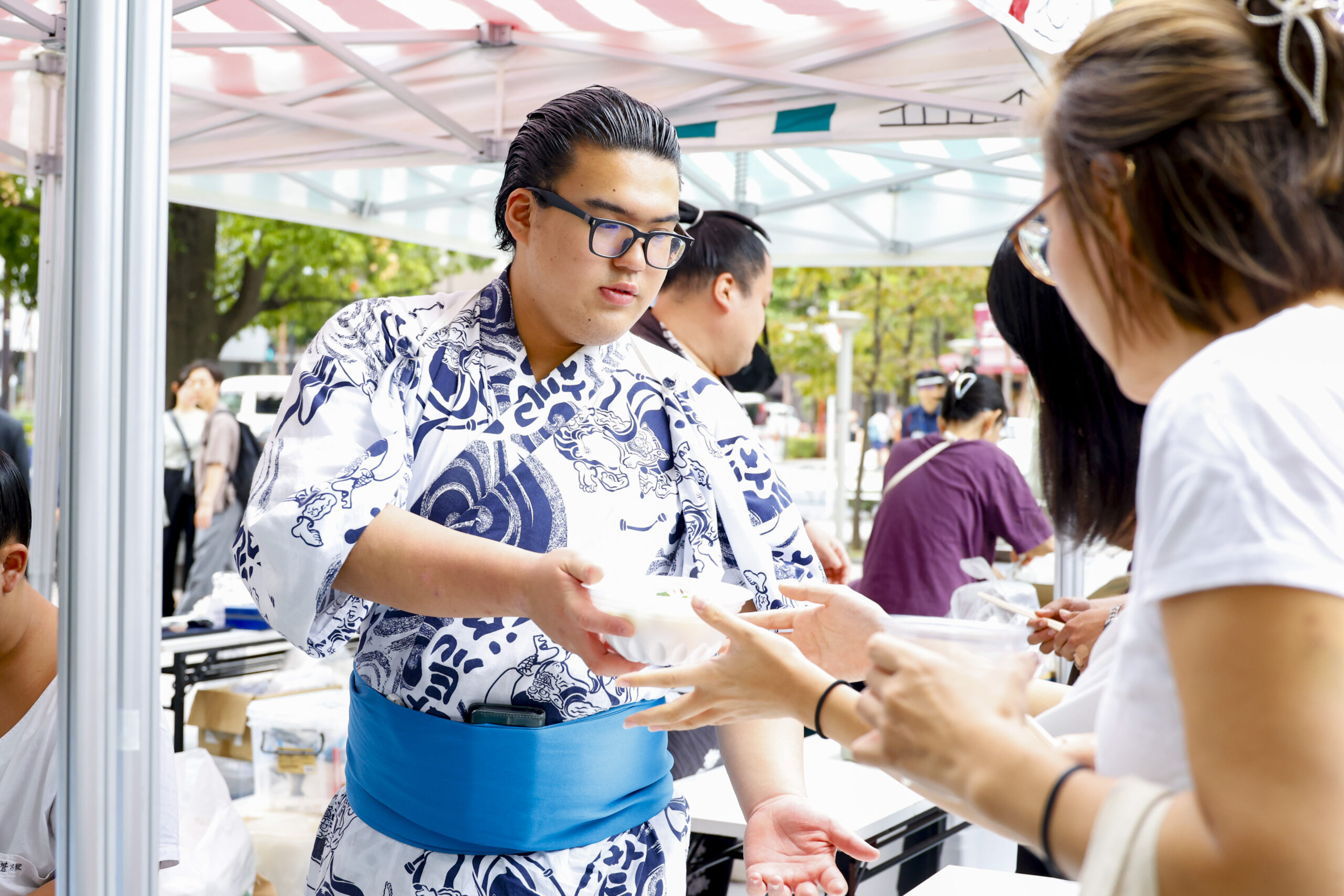 大相撲は年に6場所ありますが、そのうち3場所は地方での興行なので、力士たちがここで過ごすのは一年の半分ほど。旅ガラスのような生活を送る力士にとって、まちのためにできることは限られています。それでも最近は、「荒汐部屋」のちゃんこ長と一緒に料理教室を開催したり、数人の力士と「浜町マルシェ」に参加してちゃんこ鍋を提供したりしています。